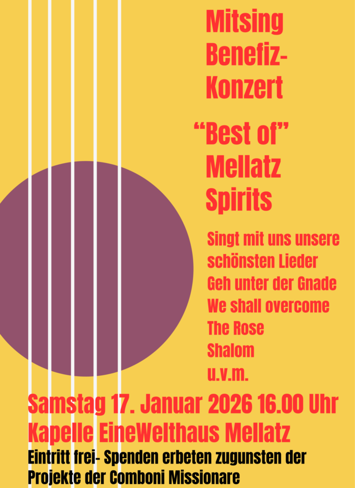 Opfenbach-Mellatz, Daniele Comboni EineWeltHaus Mellatz 39, OpfenbachSamstag, 17. Januar 2026 Kapelle im Daniele Comboni EineWeltHaus Mellatz 16:00 Uhr Mitsing-Benefiz-Konzert "Best of" Mellatz Spirits Singt mit uns [...]