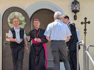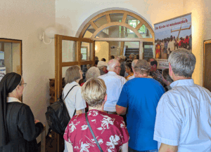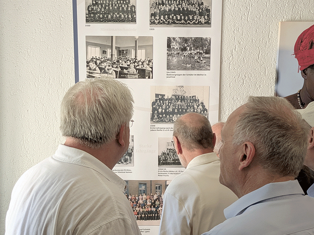Den kurzen Spaziergang von der Basilika zum Missionshaus genoss auch der Bischof, wo er vor dem Mittagessen und Kaffee und Kuchen noch das Missionshaus und die darin lebenden und arbeitenden Menschen segnete. Viele Ehemalige interessierten sich für die angebotenen Hausführungen, wo man in einer neuen Dauerausstellung auch mehr über das Haus, seine Geschichte und die Arbeit der Missionare erfahren konnte.