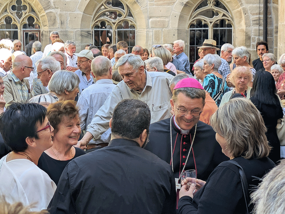 Nach dem Gottesdienst traf man sich auf Einladung von Pfarrer Dr. Sven van Meegen von der Pfarrei St. Vitus im Kreuzganggarten zu einem Stehempfang, der mit einer Fragerunde an den Bischof im Jeningenheim endete.