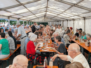 - Gespräche und gutes Essen unter dem Zeltdach.